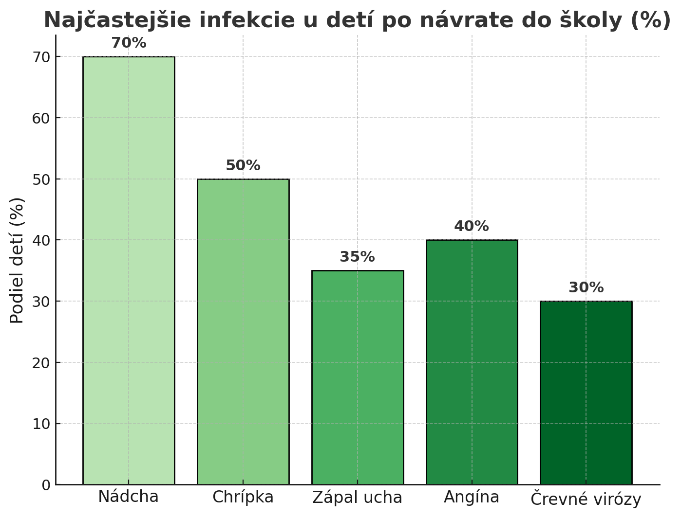 Po návrate do školy patria medzi najčastejšie ochorenia nádchy a prechladnutia, chrípka, zápaly stredného ucha, angíny či črevné virózy. Ide o infekcie, ktoré sa rýchlo šíria v kolektíve, kde deti trávia spolu veľa času a hygienické návyky ešte nemusia byť úplne zvládnuté.