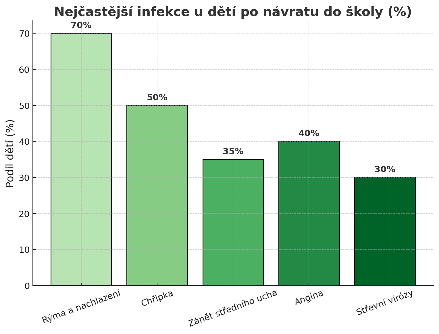 Září je měsíc plný očekávání – děti se vracejí do školy, setkávají se se spolužáky, poznávají nové kamarády a znovu se učí fungovat v kolektivu. Pro rodiče ale tento čas přináší také obavy: s návratem do tříd přichází vyšší riziko infekcí. V prostředí, kde je mnoho dětí pohromadě, se totiž nemoci šíří rychleji než během letních prázdnin. Rýma, kašel, chřipka či střevní virózy se tak stávají nepříjemnou součástí podzimních měsíců.