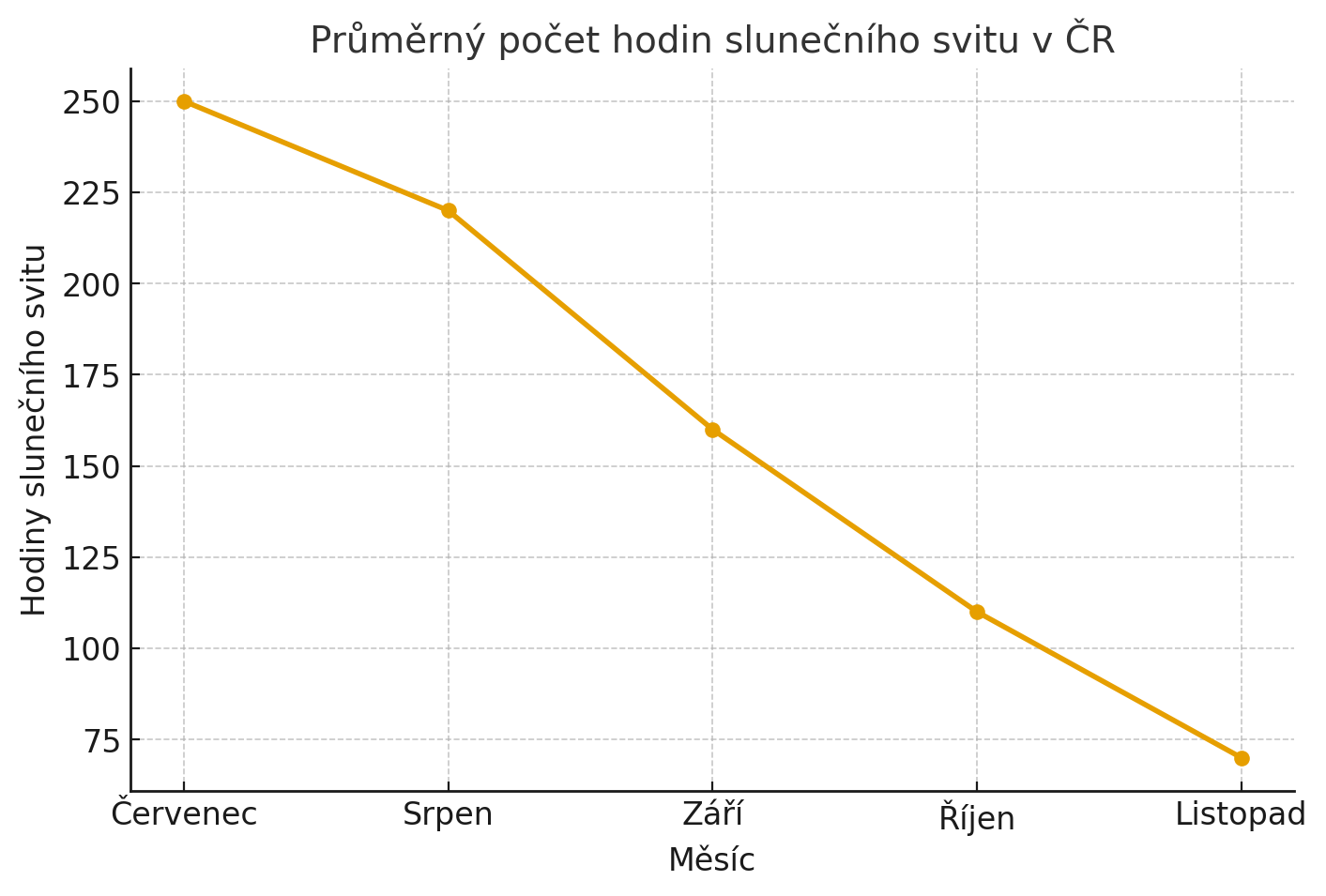 Jak ukazuje graf, během několika měsíců se sluneční svit sníží o více než dvě třetiny. V červenci máme běžně kolem 250 hodin slunce, v listopadu sotva 70. Tento rozdíl je pro organismus obrovským šokem.