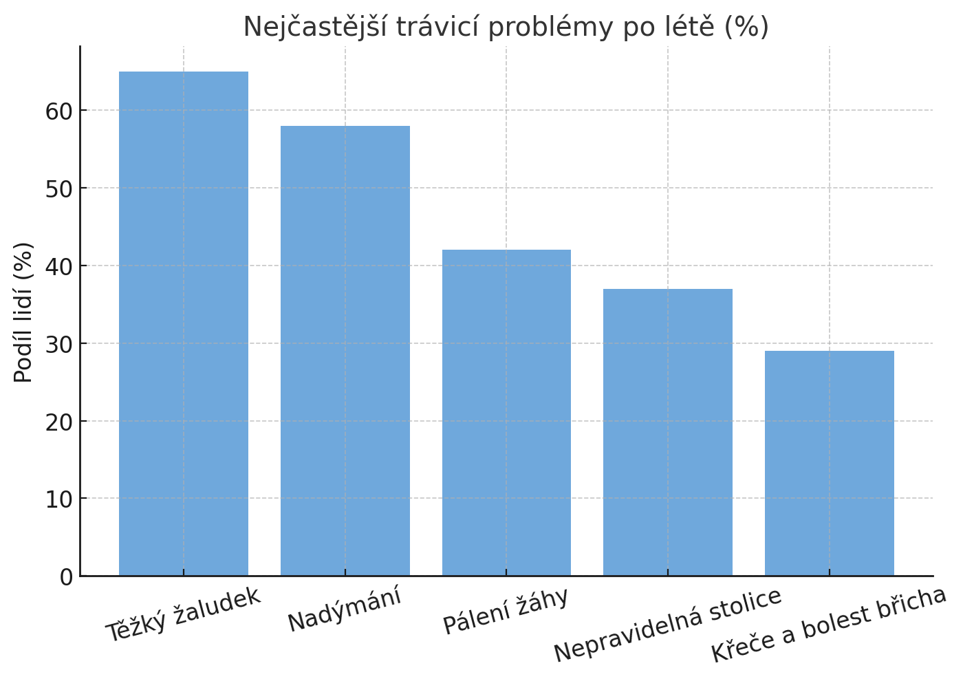 Léto je obdobím volnosti, cestování a kulinárních zážitků. Často si dopřejeme více, než je běžné – grilovaná masa, smažené speciality, tučné sýry, osvěžující alkoholické drinky či sladké dezerty. K tomu se přidává nepravidelný režim, pozdní večeře a rychlé občerstvení na cestách. To všechno představuje pro trávicí systém velkou zátěž, která se po návratu domů projeví nepříjemnými problémy. Těžký žaludek, nadýmání, pálení žáhy, průjem nebo zácpa patří mezi typické letní potíže.
