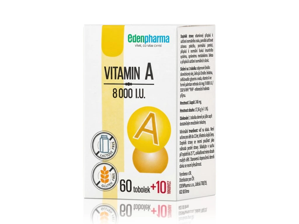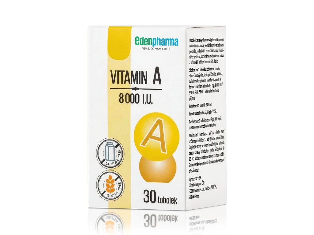 Vitamín A 8000 IU od EDENPharmy je doplněk stravy určený k doplnění vitamínu A v organismu. Tento produkt obsahuje vitamín A ve formě retinyl palmitátu, která je dobře využitelná pro organismus. Každá kapsle poskytuje 8000 IU vitamínu A, což představuje vysokou dávku pro efektivní doplnění jeho hladiny. Měkké kapsle obsahují vitamín A rozpuštěný ve slunečnicovém oleji, což může podpořit jeho lepší vstřebávání, protože jde o vitamín rozpustný v tucích. Praktická forma měkkých kapslí zároveň umožňuje jednoduché a pohodlné užívání.
